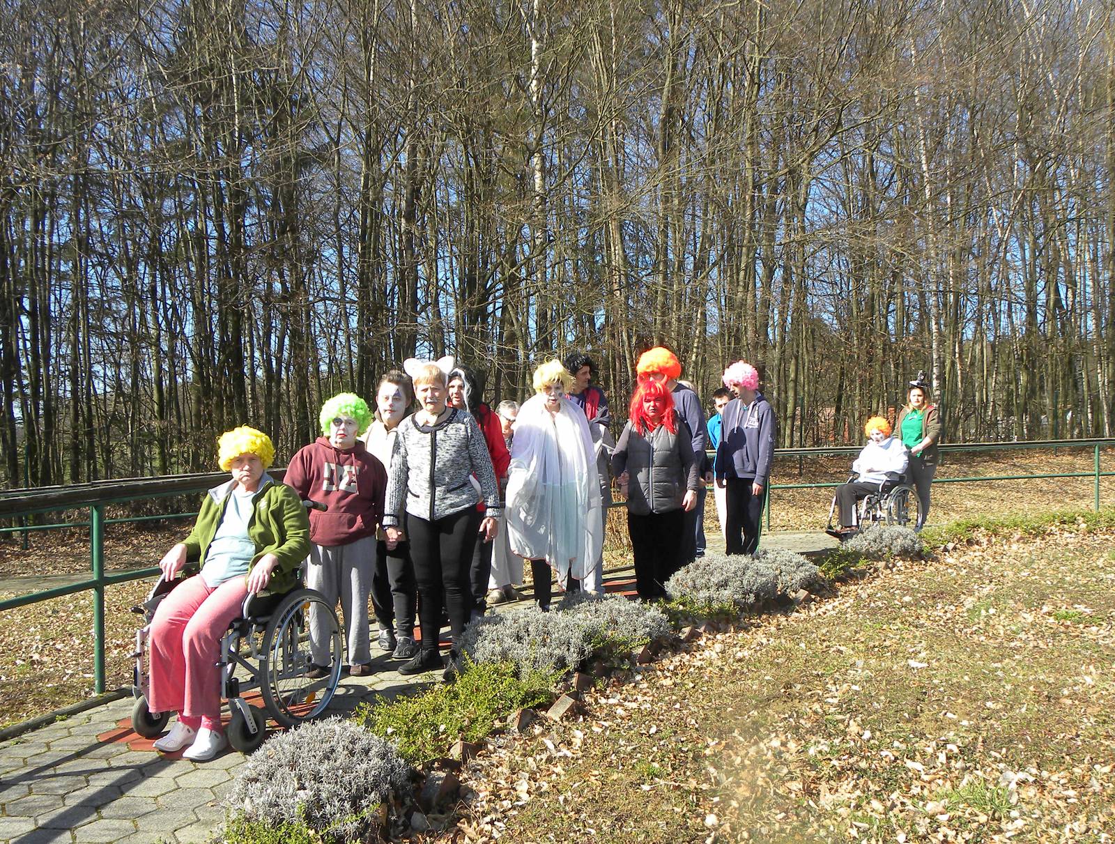 Tudi v naši enoti so se za en dan spremenili v pustne maske. Delavka Nataša jih je z barvami poslikala po obrazu. Kar nekaj je bilo klovnov in mačk. V družbi mask je bil tudi hudiček, ki je imel vse pod nadzorom. Ob glasbi so zaplesali in vriskali. Nato so se sprehodili po parku, kjer jih je spremljalo sonce. Preživeli so lep, šegavi in malo drugačen dopoldan. Bilo nam je lepo.