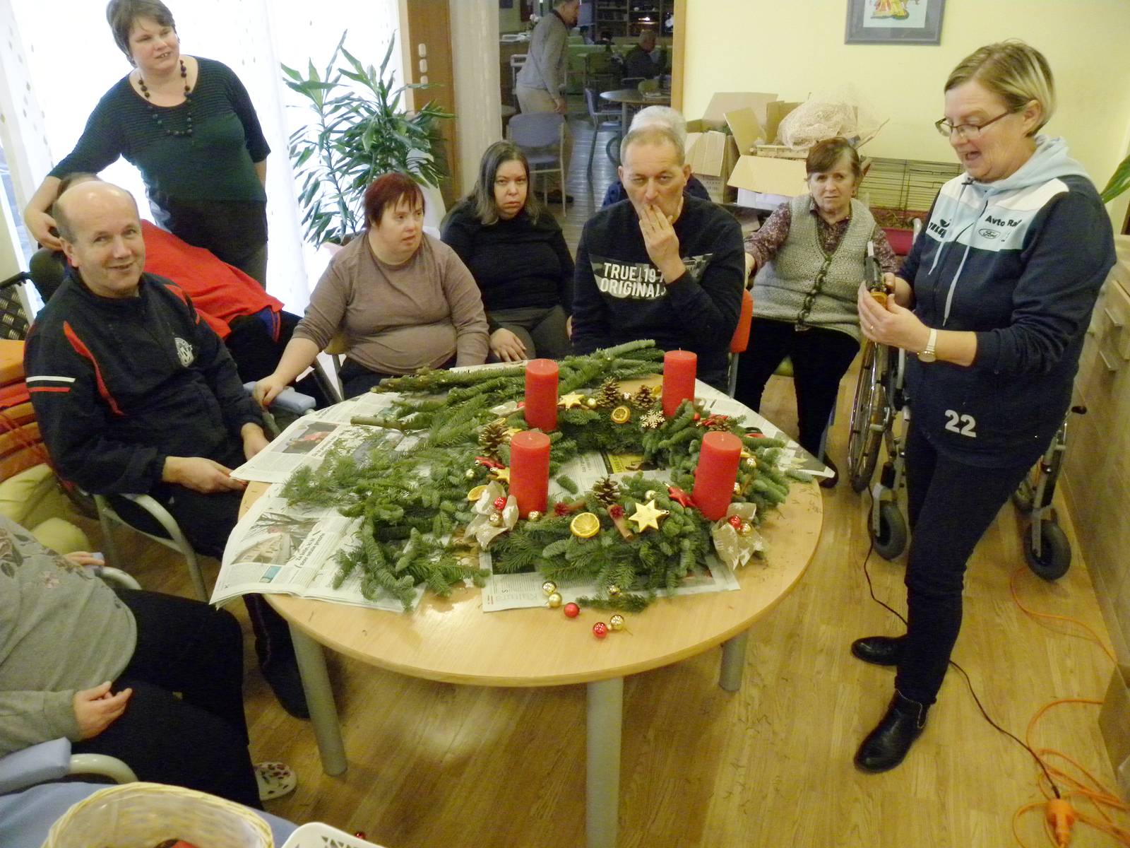 V DBE Trnovska vas je prišla prostovoljka ga. Saša, ki je skupaj s stanovalci izdelala velik adventni venček za dnevni prostor. Stanovalci so z navdušenjem opazovali in sodelovali. Vsi skupaj so v pričakovanju adventnega časa in prihajajočih praznikov.