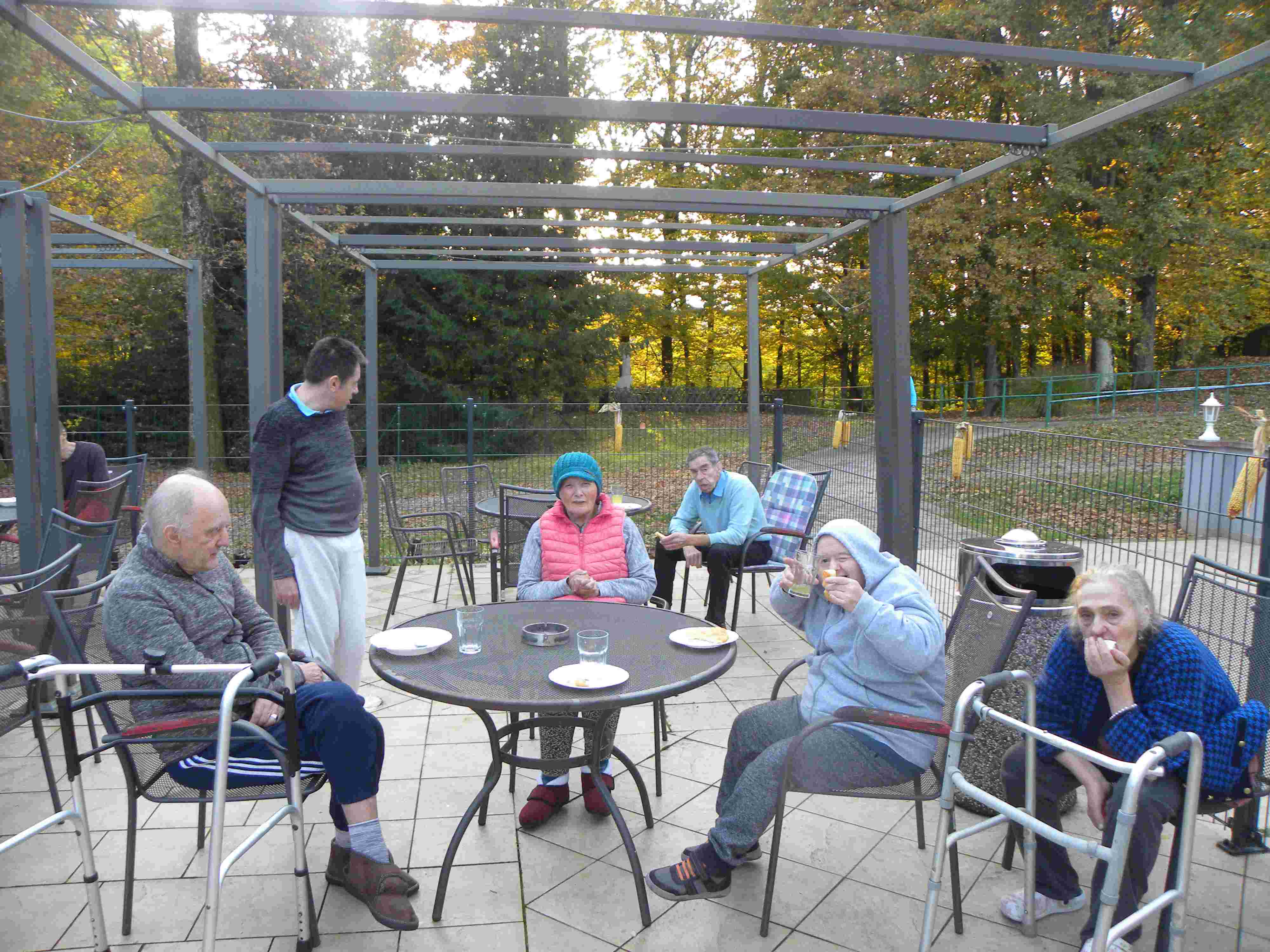 Ni lepšega kot lep, sončenjesenski dan, ki nas kar vabi na posedanje po terasahin sprehodih po parku. Tako smo ta dan izkoristili za piknik ob prekmurski jedi "langaš". Kuhar nam je pripravil testo, kar je osnova za dober "langaš" in česnovo omako. Nato smo ga skupaj s stanovalci oblikovali incvrli na terasi. Da ni samo omamno dišalo smo ga kar sproti pojedli za popoldansko malico, da smo zadovoljili brbončice. Vsi so bili zelo zadovoljni in spraševali, kdaj bomospet kaj pekli.Kljub določenim omejitvam, jim lahko naredimo bivanje na enoti prijetno.