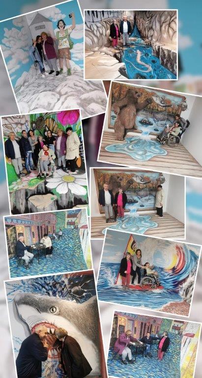 S stanovalci Depandanse B2 smo se danes odpravili na ogled 3D ART Muzeja v Gornji Radgoni. Avtorica, slikarka Tamara Vogrin Tara je upodobila 13 tematik na kar 263 m2 likovnih površin. S posebno slikarsko tehniko je omogočila, da se obiskovalci zlijejo z umetniškimi slikami v vlogi raziskovalca, popotnika, športnika … Obiskovalci lahko zaživijo kot živ del magičnih slovenskih pokrajin, ljudskega izročila in znamenitosti. Stanovalci so ob videnem zelo uživali, vživeli so se v razne vloge, navdušeni so bili nad učinkom 3D fotografij. Po ogledu smo se odpeljali še na sladoled in kavo s smetano, kjer smo se pogovarjali o vtisih iz razstave.